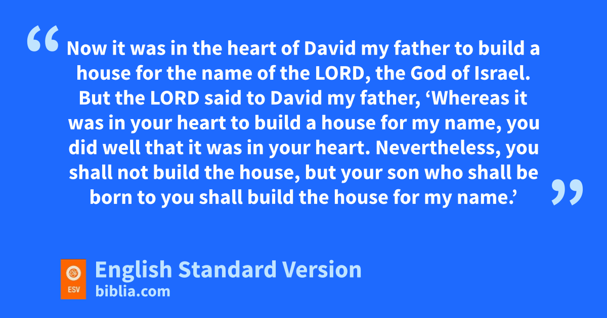 12 yThen Solomon said, “The Lord1 has said that he would dwell zin thick darkness. 13 aI have indeed built you an exalted house, ba place for you to dwell in forever.” 14 Then the king turned around and cblessed all the assembly of Israel, while all the assembly of Israel stood. 15 And he said, d“Blessed be the Lord, the God of Israel, who with his hand has fulfilled ewhat he promised with his mouth to David my father, saying, 16 f‘Since the day that I brought my people Israel out of Egypt, I chose no city out of all the tribes of Israel in which to build a house, gthat my name might be there. hBut I chose David to be over my people Israel.’ 17 iNow it was in the heart of David my father to build a house for the name of the Lord, the God of Israel. 18 But the Lord said to David my father, ‘Whereas it was in your heart to build a house for my name, you did well that it was in your heart. 19 jNevertheless, you shall not build the house, but your son who shall be born to you shall build the house for my name.’ 20 Now the Lord has fulfilled his promise that he made. For I have risen in the place of David my father, and sit on the throne of Israel, kas the Lord promised, and I have built the house for the name of the Lord, the God of Israel. 21 And there I have provided a place for the ark, lin which is the covenant of the Lord that he made with our fathers, when he brought them out of the land of Egypt.”