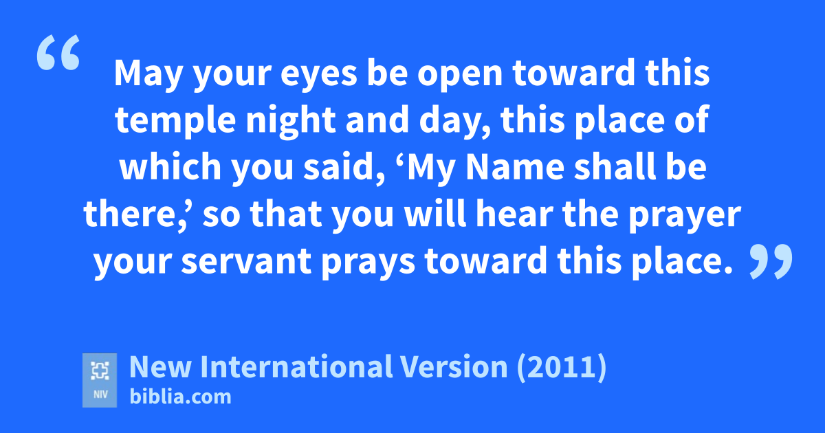 27 “But will God really dwellz on earth? The heavens, even the highest heaven,a cannot containb you. How much less this temple I have built! 28 Yet give attention to your servant’s prayer and his plea for mercy, Lord my God. Hear the cry and the prayer that your servant is praying in your presence this day. 29 May your eyes be openc towardd this temple night and day, this place of which you said, ‘My Namee shall be there,’ so that you will hear the prayer your servant prays toward this place. 30 Hear the supplication of your servant and of your people Israel when they prayf toward this place. Hearg from heaven, your dwelling place, and when you hear, forgive.h
