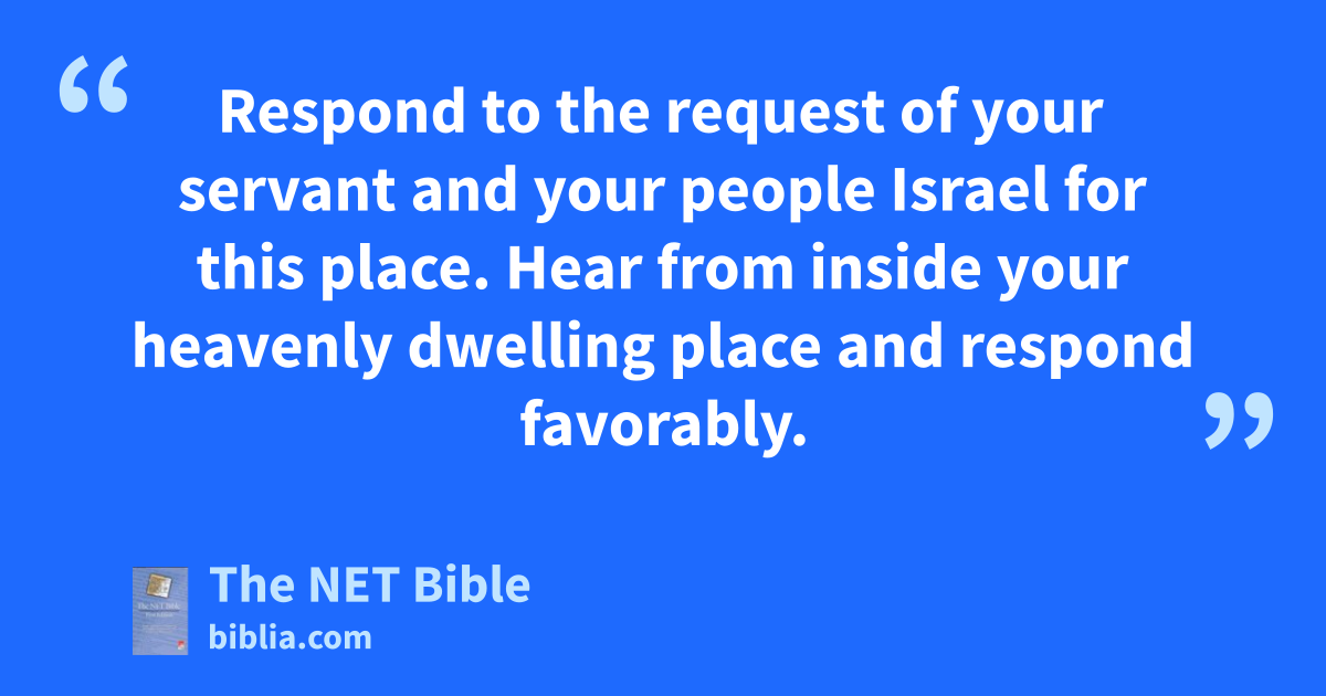 8:27 “God does not really live on the earth!40 Look, if the sky and the highest heaven cannot contain you, how much less this temple I have built! 8:28 But respond favorably to41 your servant’s prayer and his request for help, O Lord my God. Answer42 the desperate prayer43 your servant is presenting to you44 today. 8:29 Night and day may you watch over this temple, the place where you promised you would live.45 May you answer your servant’s prayer for this place.46 8:30 Respond to the request of your servant and your people Israel for this place.47 Hear from inside your heavenly dwelling place48 and respond favorably.49