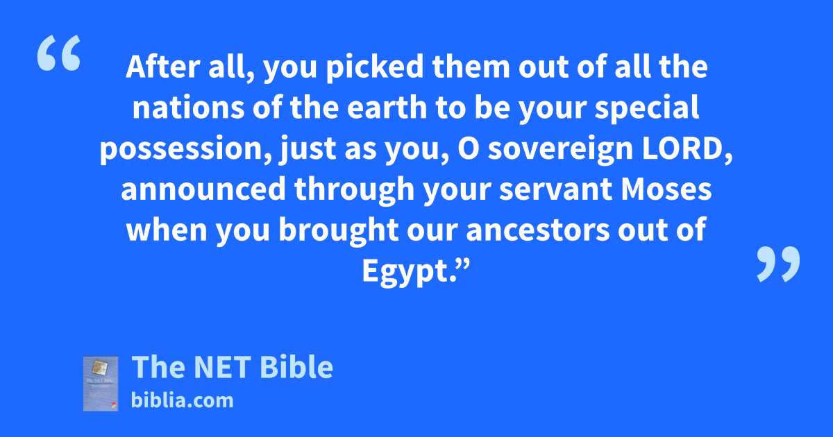 8:52 “May you be attentive98 to your servant’s and your people Israel’s requests for help and may you respond to all their prayers to you.99 8:53 After all,100 you picked them out of all the nations of the earth to be your special possession,101 just as you, O sovereign Lord, announced through your servant Moses when you brought our ancestors out of Egypt.”