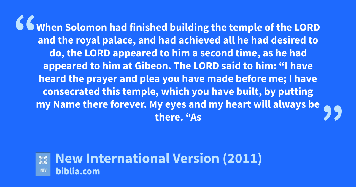 9 When Solomon had finishedr building the temple of the Lord and the royal palace, and had achieved all he had desired to do, 2 the Lord appeareds to him a second time, as he had appeared to him at Gibeon. 3 The Lord said to him: