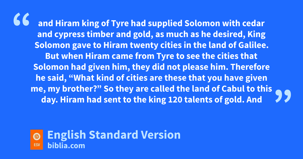 10 yAt the end of ztwenty years, in which Solomon had built the two houses, the house of the Lord and the king’s house, 11 and Hiram king of Tyre had supplied Solomon with cedar and cypress timber and gold, as much as he desired, King Solomon gave to Hiram twenty cities in the land of Galilee. 12 But when Hiram came from Tyre to see the cities that Solomon had given him, they did not please him. 13 Therefore he said, “What kind of cities are these that you have given me, my brother?” So they are called the land of aCabul to this day. 14 Hiram had sent to the king 120 talents2 of gold.