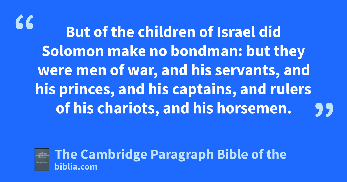 15 And this is the reason of uthe levy which king Solomon raised; for to build the house of the Lord, and his own house, and xMillo, and the wall of Jerusalem, and yHazor, and zMegiddo, and aGezer. 16 For Pharaoh king of Egypt had gone up, and taken Gezer, and burnt it with fire, and slain the bCanaanites that dwelt in the city, and given it for a present unto his daughter, cSolomon’s wife. 17 * And Solomon built Gezer, and dBeth-horon the nether, 18 and eBaalath, and Tadmor in the wilderness, in the land, 19 and all the cities of fstore that Solomon had, and gcities for his hchariots, and cities for his horsemen, and * that which Solomon desired to build in Jerusalem, and in Lebanon, and in all the land of his dominion. 20 And all the people that were left of the Amorites, Hittites, Perizzites, Hivites, and Jebusites, which were not of the children of Israel, 21 their children ithat were left after them in the land, jwhom the children of Israel also were not able utterly to destroy, kupon those did Solomon levy a tribute of lbondservice unto this day. 22 But of the children of Israel did Solomon mmake no bondman: but they were men of war, and his servants, and his princes, and his captains, and rulers of his chariots, and his horsemen. 23 These were the chief of the nofficers that were over Solomon’s work, ofive hundred and fifty, pwhich bare rule over the people that wrought in the work. 24 But qPharaoh’s daughter came up out of the city of David unto rher house which Solomon had built for her: then did he build sMillo. 25 And tthree times in a year did Solomon offer burnt offerings and peace offerings upon the altar which he built unto the Lord, and he burnt incense * upon the altar that was before the Lord. So he finished the house.