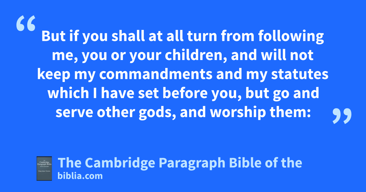 IX. And ait came to pass, when Solomon had finished the building of the house of the Lord, band the king’s house, and all Solomon’s cdesire which he was pleased to do, 2 that the Lord appeared to Solomon the second time, das he had appeared unto him at eGibeon. 3 And the Lord said unto him, I have heard thy prayer and thy supplication, that thou hast made before me: I have hallowed this house, which thou hast built, fto put my name there for ever; gand mine eyes and mine heart shall be there perpetually. 4 And if thou wilt hwalk before me, ias David thy father walked, in integrity of heart, and in uprightness, to do according to all that I have commanded thee, and wilt keep my statutes and my judgments: 5 then I will establish the throne of thy kingdom upon Israel for ever, kas I promised to David thy father, saying, There shall not fail thee a man upon the throne of Israel. 6 But if you shall at all lturn from following me, you or your children, and will not keep my commandments and my statutes which I have set before you, but go and serve other gods, and worship them: 7 mthen will I cut off Israel out of the land which I have given them; and this house, which I have hallowed nfor my name, will I cast out of my sight; oand Israel shall be a proverb and a byword among all people: 8 and at this house, pwhich is high, every one that passeth by it shall be astonished, and shall hiss; and they shall say, qWhy hath the Lord done thus unto this land, and to this house? 9 And they shall answer, Because they forsook the Lord their God, who brought forth their fathers out of the land of Egypt, and have taken hold upon other gods, and have worshipped them, and served them: therefore hath the Lord brought upon them all this evil.