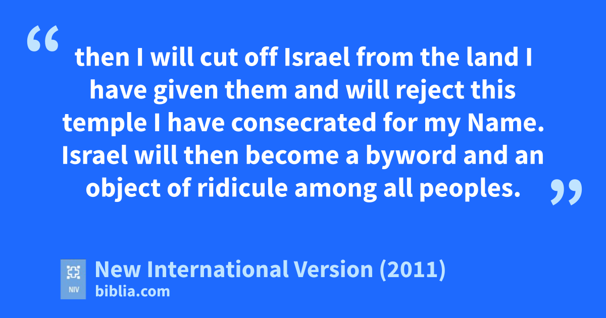 6 “But if youa or your descendants turn awayb from me and do not observe the commands and decrees I have given youb and go off to serve other godsc and worship them, 7 then I will cut off Israel from the landd I have given them and will reject this temple I have consecrated for my Name.e Israel will then become a bywordf and an object of ridiculeg among all peoples. 8 This temple will become a heap of rubble. Allc who pass by will be appalledh and will scoff and say, ‘Why has the Lord done such a thing to this land and to this temple?’i 9 People will answer,j ‘Because they have forsakenk the Lord their God, who brought their ancestors out of Egypt, and have embraced other gods, worshiping and serving them—that is why the Lord brought all this disasterl on them.’ ”