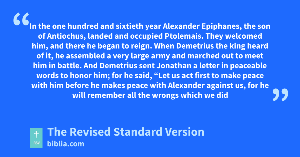 1 In the one hundred and sixtieth year Alexander Epiphanes, the son of Antiochus, landed and occupied Ptolemais. They welcomed him, and there he began to reign. 2 When Demetrius the king heard of it, he assembled a very large army and marched out to meet him in battle. 3 And Demetrius sent Jonathan a letter in peaceable words to honor him; 4 for he said, “Let us act first to make peace with him before he makes peace with Alexander against us, 5 for he will remember all the wrongs which we did to him and to his brothers and his nation.” 6 So Demetrius gave him authority to recruit troops, to equip them with arms, and to become his ally; and he commanded that the hostages in the citadel should be released to him.
