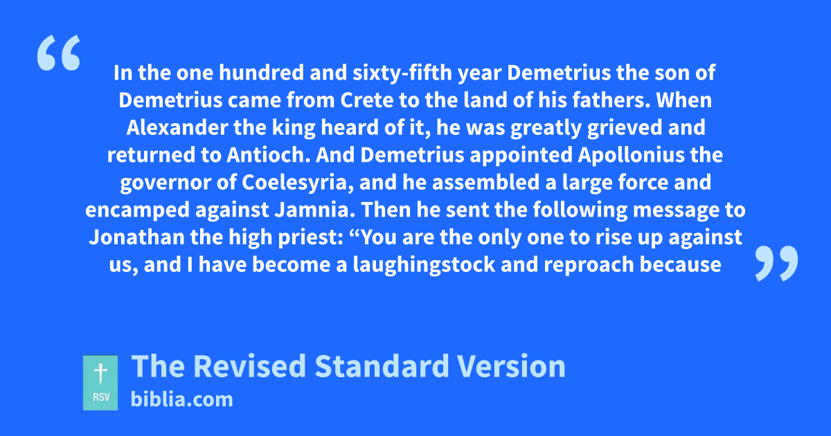 67 In the one hundred and sixty-fifth year Demetrius the son of Demetrius came from Crete to the land of his fathers. 68 When Alexander the king heard of it, he was greatly grieved and returned to Antioch. 69 And Demetrius appointed Apollonius the governor of Coelesyria, and he assembled a large force and encamped against Jamnia. Then he sent the following message to Jonathan the high priest:
