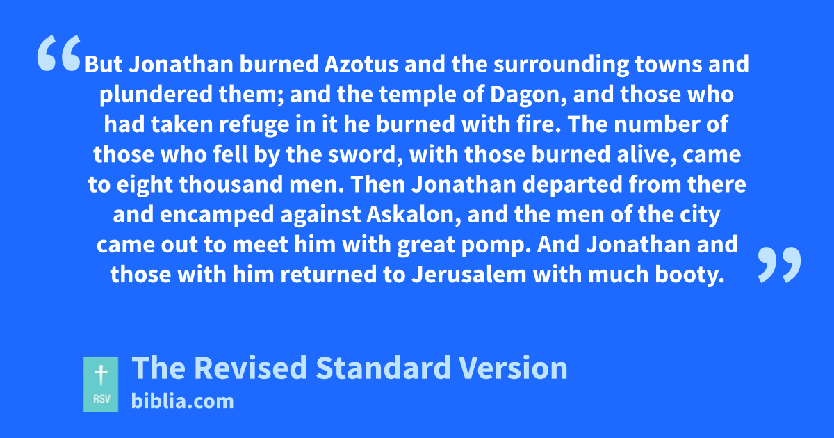 82 Then Simon brought forward his force and engaged the phalanx in battle (for the cavalry was exhausted); they were overwhelmed by him and fled, 83 and the cavalry was dispersed in the plain. They fled to Azotus and entered Beth-dagon, the temple of their idol, for safety. 84 But Jonathan burned Azotus and the surrounding towns and plundered them; and the temple of Dagon, and those who had taken refuge in it he burned with fire. 85 The number of those who fell by the sword, with those burned alive, came to eight thousand men.