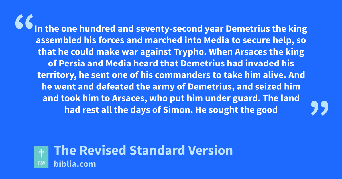 1 In the one hundred and seventy-second year Demetrius the king assembled his forces and marched into Media to secure help, so that he could make war against Trypho. 2 When Arsaces the king of Persia and Media heard that Demetrius had invaded his territory, he sent one of his commanders to take him alive. 3 And he went and defeated the army of Demetrius, and seized him and took him to Arsaces, who put him under guard. 4 The land had rest all the days of Simon.