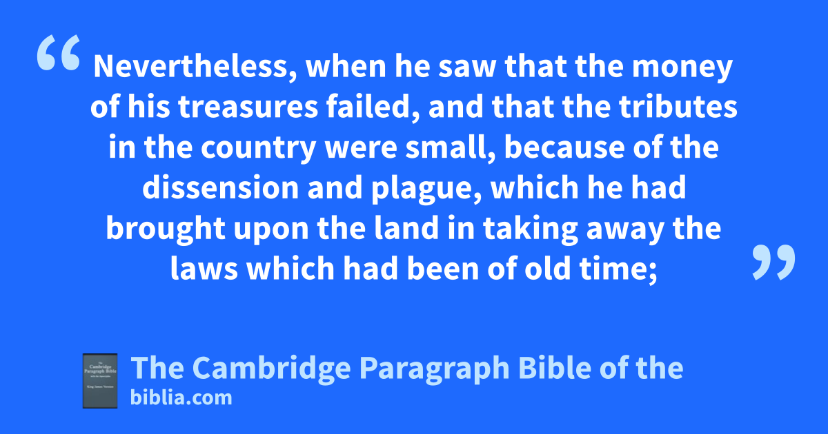 27 Now when yking Antiochus heard these things, he was full of indignation: wherefore he sent and gathered together all the forces of his realm, even a very strong darmy. 28 He opened also his treasure, and gave his soldiers zpay for a year, commanding them to be ready * whensoever he should need them. 29 Nevertheless, when he saw that the money of his treasures failed, and * that the tributes in the country were small, because of the dissension and plague, which he had brought upon the land * in taking away the laws which had been of old time; 30 he feared * that he should not be able to bear the charges aany longer, nor to have such gifts to give so liberally as he did before: for bhe had abounded above the kings that were before him. 31 Wherefore, being greatly cperplexed in his mind, he determined to go into dPersia, there to take the tributes of the countries, and to gather much money. 32 So he left eLysias, a nobleman, and one eeof the blood royal, to oversee the affairs of the king from the river Euphrates unto the borders of Egypt: 33 and to bring up fhis son Antiochus, until he came again. 34 Moreover he delivered unto him the half of his forces, and gthe elephants, and gave him charge of all things that he would have done, as also concerning them that dwelt in Juda and Jerusalem: 35 to wit, that he should send an army against them, to destroy and root out the strength of Israel, and hthe remnant of Jerusalem, and ito take away their memorial from that place; 36 and that he should place strangers in all their quarters, and divide their land by lot. 37 So the king took the half of the forces that remained, and departed from jAntioch, * his royal city, * the hundred forty and seventh year; and having passed the river Euphrates, dhe went through kthe high countries.