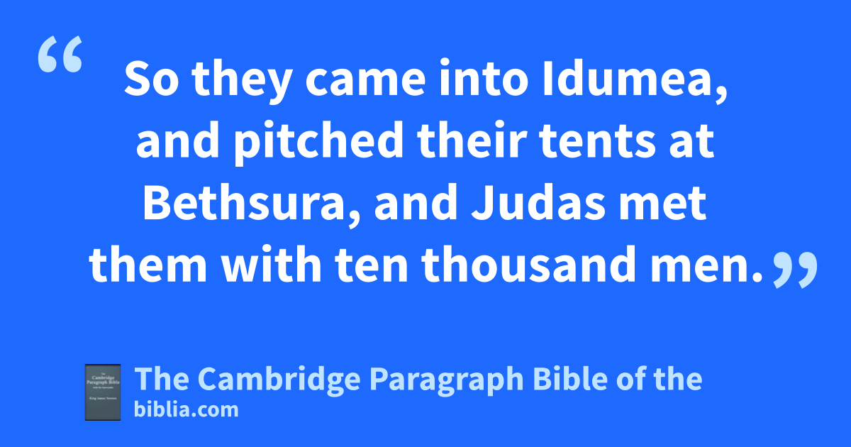 26 Now all the strangers that had escaped came and told uLysias what had happened: 27 who, when he heard thereof, vwas confounded and discouraged wbecause neither such things as he would were done unto Israel, nor such things as the king commanded him were come to pass. 28 * The next year therefore following Lysias gathered together bthreescore thousand choice men of foot, and five thousand horsemen, that he might subdue them. 29 So they came into mIdumea, and pitched their tents at xBethsura, and Judas met them with yten thousand men. 30 And when he saw that mighty carmy, he prayed and said, Blessed art thou, O Saviour of Israel, zwho didst quail the violence of the mighty man by the hand of thy servant David, and gavest the host of * strangers ainto the hands of Jonathan the son of Saul, and his armourbearer; 31 bshut up this army in the hand of thy people Israel, and let them be confounded in their power and horsemen: 32 make them to be of no courage, and cause the boldness of their strength to * fall away, and let them quake at their destruction: 33 cast them down with the sword of them that love thee, and let all those that know thy name praise thee with thanksgiving.