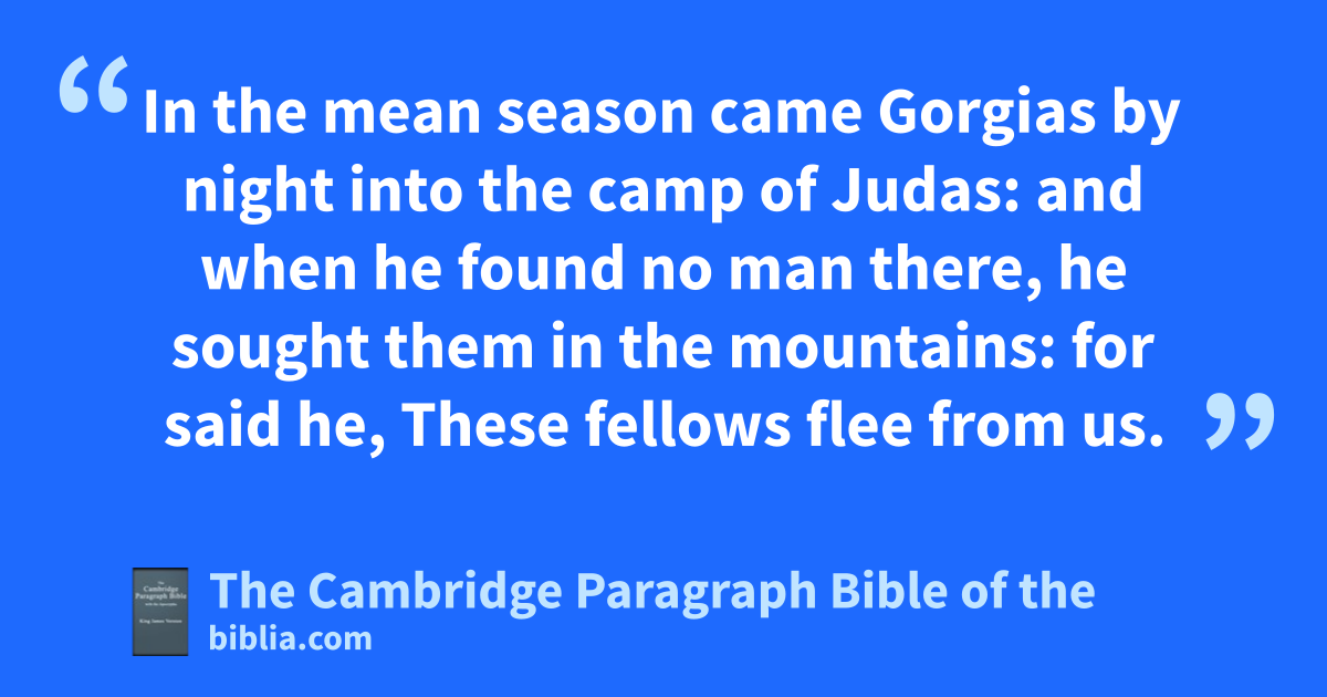 IV. Then took aGorgias bfive thousand footmen, and a thousand of the best horsemen, and removed out of cthe camp by night; 2 to the end he might rush in upon cthe camp of the Jews, and smite them suddenly. And the men of dthe fortress were his guides. 3 Now when Judas heard thereof, he himself removed, and the valiant men with him, that he might smite ethe king’s army which was at Emmaus, 4 while as yet the forces were dispersed from cthe camp. 5 In the mean season came aGorgias by night into cthe camp of Judas: and when he found no man there, he sought them in the mountains: for said he, These fellows flee from us.
