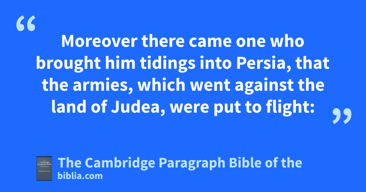 VI. About that time aking Antiochus travelling through athe high countries, heard say that bElymais in the country of bbPersia was a city greatly renowned for riches, silver, and gold; 2 and that there was in it a very rich temple, wherein were * coverings of gold, and breastplates, and * shields, which cAlexander, son of Philip, the Macedonian king, cwho reigned first among the Grecians, had left there. 3 Wherefore dhe came and sought to take the city, and to spoil it; but he was not able, because they of the city, having had warning thereof, 4 rose up against him in battle: so he fled, and departed thence with great heaviness, and returned to wBabylon. 5 Moreover there came one who brought him tidings ddinto Persia, that the armies, which went against the land of Judea, were put to flight: 6 and that eLysias, who went forth first with a great power, was driven away of the Jews; and that they were made strong by the armour, and power, and fstore of spoils, which they had gotten of the armies, whom they had destroyed: 7 also that gthey had pulled down hthe abomination, which he had set up upon the altar in Jerusalem, and that ithey had compassed about the sanctuary with high walls, as before, and his city kBethsura. 8 Now when the king heard these words, he was astonished and sore moved: lwhereupon he laid him down upon his bed, and fell sick for grief, mbecause it had not befallen him as he looked for. 9 And there he continued many days: nfor his grief was ever more and more, and he made account that he should die. 10 Wherefore he called for all his friends, and said unto them, The sleep is gone from mine eyes, and my heart faileth for very care. 11 And I thought with myself, Into what tribulation am I come, and how great a flood of misery is it, wherein now I am! for I was obountiful and beloved in my power. 12 But now I remember the evils that I did at Jerusalem, and that pI took all the vessels of gold and silver that were therein, and qsent to destroy the inhabitants of Judea without a cause. 13 I perceive therefore that for this cause these rtroubles are come upon me, and behold, I perish through great grief in a strange land. 14 Then called he for sPhilip, one of his friends, whom he made ruler over all his realm, 15 and gave him tthe crown, and his robe, and his usignet, to the end * he should bring up his son Antiochus, and nourish him up for the kingdom. 16 vSo king Antiochus died wthere in * the hundred forty and ninth year. 17 Now when xLysias knew that the king was dead, he set up Antiochus his son (xwhom he had brought up, being young) to reign in his stead, and his name he called yEupator.