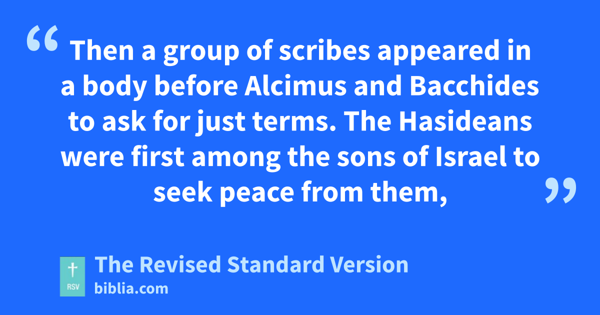 12 Then a group of scribes appeared in a body before Alcimus and Bacchides to ask for just terms. 13 The Hasideans were first among the sons of Israel to seek peace from them, 14 for they said, “A priest of the line of Aaron has come with the army, and he will not harm us.” 15 And he spoke peaceable words to them and swore this oath to them, “We will not seek to injure you or your friends.” 16 So they trusted him; but he seized sixty of them and killed them in one day, in accordance with the word which was written, 17 “The flesh of thy saints and their blood