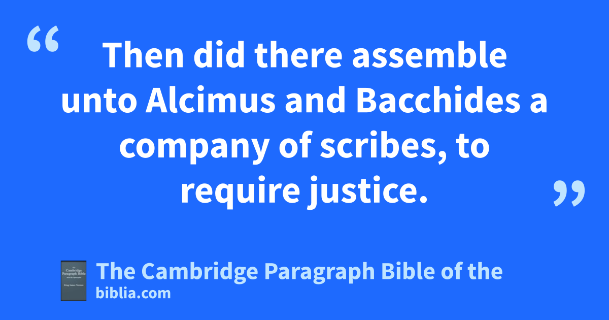 8 Then the king chose fBacchides, ga friend of the king, who ruled hbeyond the flood, and was a great man in the kingdom, and faithful to the king. 9 And him he sent with that wicked Alcimus, whom he made high priest, and commanded that he should take vengeance of the children of Israel. 10 So they departed, and came with a great power into the land of Judea, where they sent messengers to Judas and his brethren with peaceable words deceitfully. 11 But they gave no heed to their words; for they saw that they were come with a great power. 12 Then did there assemble unto Alcimus and fBacchides a company of * scribes, to require justice. 13 Now the iAsideans were the first among the children of Israel that sought peace of them: 14 for said they, iiOne that is a priest of the seed of Aaron is come with this army, and he will do us no wrong. 15 So he spake unto them peaceably, and sware unto them, saying, We will procure the harm neither of you nor your friends. 16 Whereupon they believed him: howbeit he took of them threescore men, and slew them in one day, according to the words which jhe wrote, 17 kThe flesh of thy saints have they cast out, and their blood have they shed round about Jerusalem, and there was none to bury them. 18 Wherefore the fear and dread of them fell upon all the people, who said, There is neither truth nor * righteousness in them; for they have broken the covenant and oath that they made. 19 After this removed fBacchides from Jerusalem, and pitched his tents in Bezeth, where he sent and took many of the men that had lforsaken him, and certain of the people also, and when he had slain them, mhe cast them into the great pit. 20 Then committed he the country to Alcimus, and left with him a power to aid him: so fBacchides went unto the king.