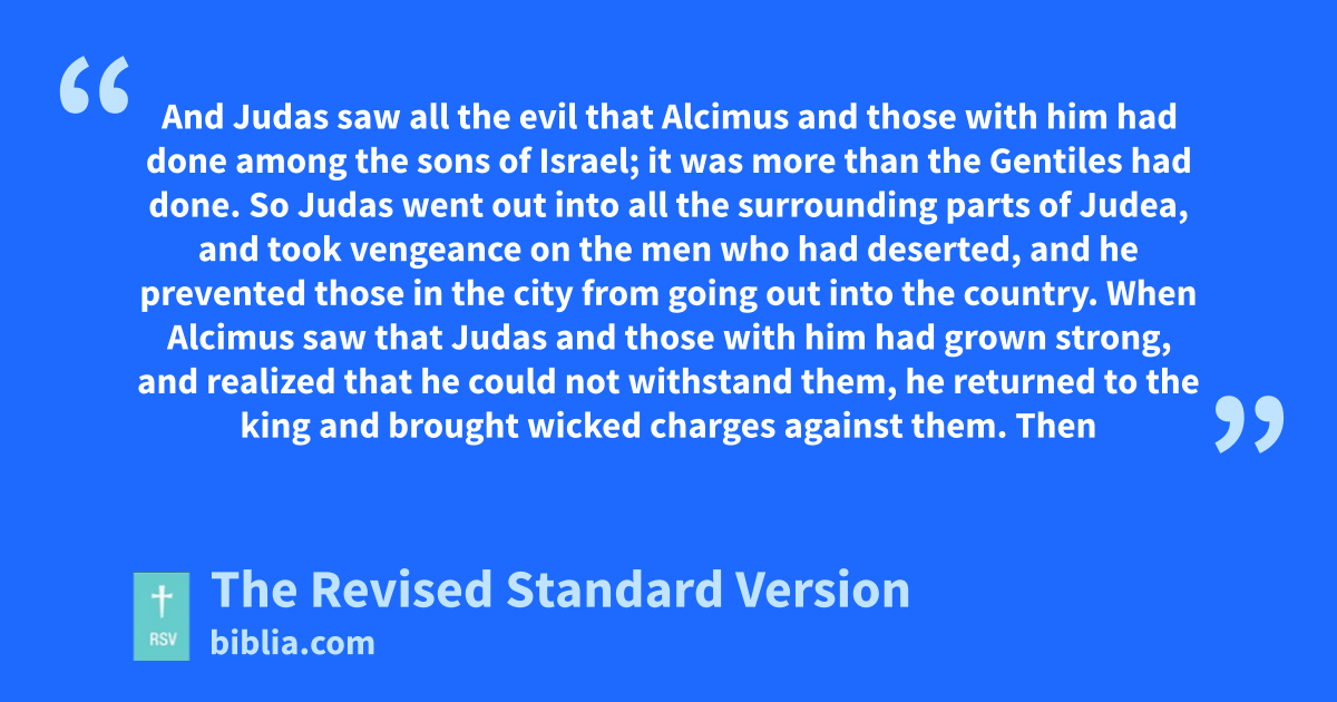 21 Alcimus strove for the high priesthood, 22 and all who were troubling their people joined him. They gained control of the land of Judah and did great damage in Israel. 23 And Judas saw all the evil that Alcimus and those with him had done among the sons of Israel; it was more than the Gentiles had done. 24 So Judas went out into all the surrounding parts of Judea, and took vengeance on the men who had deserted, and he prevented those in the city from going out into the country. 25 When Alcimus saw that Judas and those with him had grown strong, and realized that he could not withstand them, he returned to the king and brought wicked charges against them.