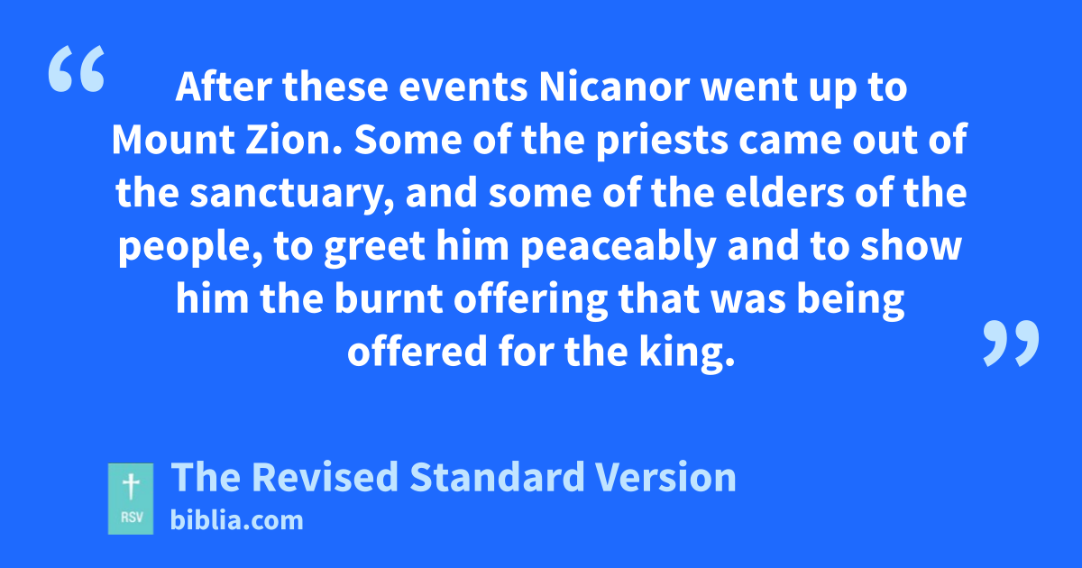 33 After these events Nicanor went up to Mount Zion. Some of the priests came out of the sanctuary, and some of the elders of the people, to greet him peaceably and to show him the burnt offering that was being offered for the king. 34 But he mocked them and derided them and defiled them and spoke arrogantly, 35 and in anger he swore this oath, “Unless Judas and his army are delivered into my hands this time, then if I return safely I will burn up this house.” And he went out in great anger. 36 Then the priests went in and stood before the altar and the temple, and they wept and said, 37 “Thou didst choose this house to be called by thy name,