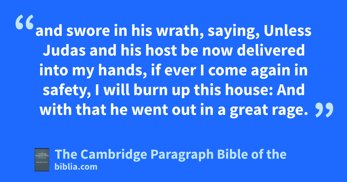 33 After this went pNicanor up rto mount Sion, and sthere came out of the sanctuary certain of the priests and certain of the elders of the people, to salute him peaceably, and to shew him the burnt sacrifice that was offered tfor the king. 34 But he mocked them, and laughed at them, and * abused them shamefully, and spake proudly, 35 and swore in his wrath, saying, Unless Judas and his host be now delivered into my hands, if ever I come again * in safety, I will burn up this house: And with that he went out in a great rage. 36 Then the priests sentered in, and stood ubefore the altar and the temple, weeping, and saying, 37 Thou, O Lord, xdidst choose this house to be called by thy name, and to be ya house of prayer and petition for thy people: 38 be avenged of this man and his host, and let them fall by the sword: remember their blasphemies, and suffer them not to continue any longer.