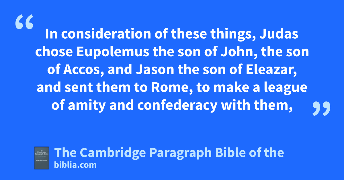 17 In consideration of these things, Judas chose gEupolemus the son of John, the son of Accos, and Jason the son of Eleazar, and sent them to aRome, to make a league of amity and confederacy with them, 18 and to intreat them that they would take pthe yoke from them; for they saw that the kingdom of hthe Grecians did oppress Israel with servitude. 19 They went therefore to Rome, which was a very great journey, and came into the isenate, where they jspake and said, 20 Judas kMaccabeus with his brethren, and the people of the Jews, have sent us unto you, to make a confederacy and peace with you, and that we might be registered your confederates and friends. 21 So lthat matter pleased the Romans well. 22 And this is the copy of the epistle which the senate wrote back again llin tables of brass, and sent to Jerusalem, that there they might have by them a memorial of peace and confederacy: