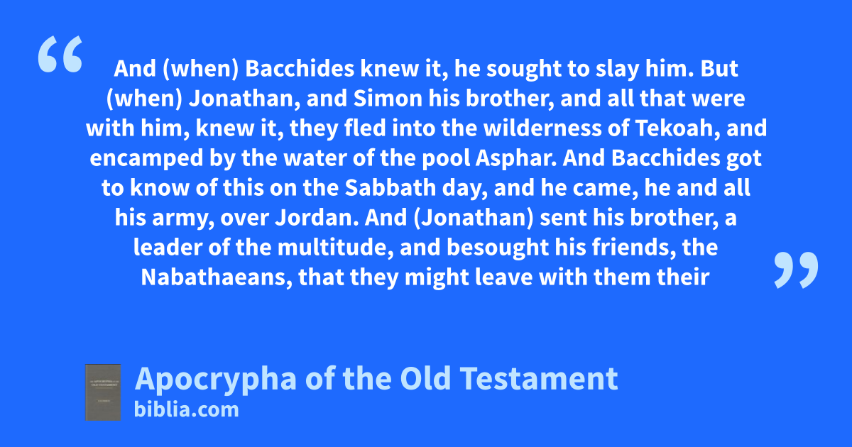 32 And (when) Bacchides knew it, he sought to slay him. 33 But (when) Jonathan, cand Simon his brother, dand all that were with himd c, knew it, they fled into the wilderness of Tekoah, and encamped by the water eof the pool Asphare. 34 fAnd Bacchides got to know of this on the Sabbath day, and he came, he and all his army, over Jordanf.