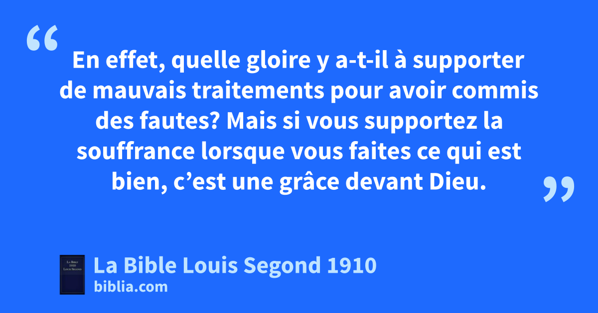 18xServiteurs, soyez soumis en toute crainte à vos maîtres, non seulement à ceux qui sont bons et doux, mais aussi à ceux qui sont d’un caractère difficile. 19yCar c’est une grâce que de supporter des afflictions par motif de conscience envers Dieu, quand on souffre injustement. 20En effet, quelle gloire y a-t-il à supporter de mauvais traitements pour avoir commis des fautes? zMais si vous supportez la souffrance lorsque vous faites ce qui est bien, c’est une grâce devant Dieu. 21Et c’est à cela que vous avez été appelés, parce que Christ aussi a souffert pour vous, avous laissant un exemple, afin que vous suiviez ses traces, 22bLui qui n’a point commis de péché, Et dans la bouche duquel il ne s’est point trouvé de fraude; 23clui qui, injurié, ne rendait point d’injures, maltraité, ne faisait point de menaces, mais s’en remettait à celui qui juge justement; 24dlui qui a porté lui-même nos péchés en son corps sur le bois, eafin que morts aux péchés nous vivions pour la justice; lui par les meurtrissures duquel vous avez été guéris. 25Car vous étiez fcomme des brebis errantes. Mais maintenant vous êtes retournés vers le pasteur et le gardien de vos âmes.