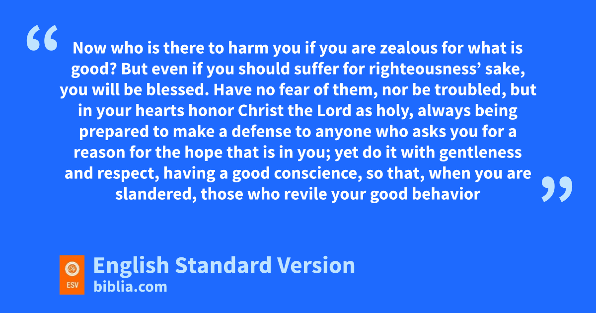 13 Now cwho is there to harm you if you are zealous for what is good? 14 dBut even if you should suffer for righteousness’ sake, you will be blessed. eHave no fear of them, fnor be troubled, 15 but gin your hearts honor Christ the Lord as holy, halways being prepared to make a defense to anyone who asks you for a reason for the hope that is in you; yet do it with gentleness and irespect, 16 jhaving a good conscience, so that, kwhen you are slandered, those who revile your good behavior in Christ may be put to shame. 17 For lit is better to suffer for doing good, if that should be God’s will, than for doing evil.