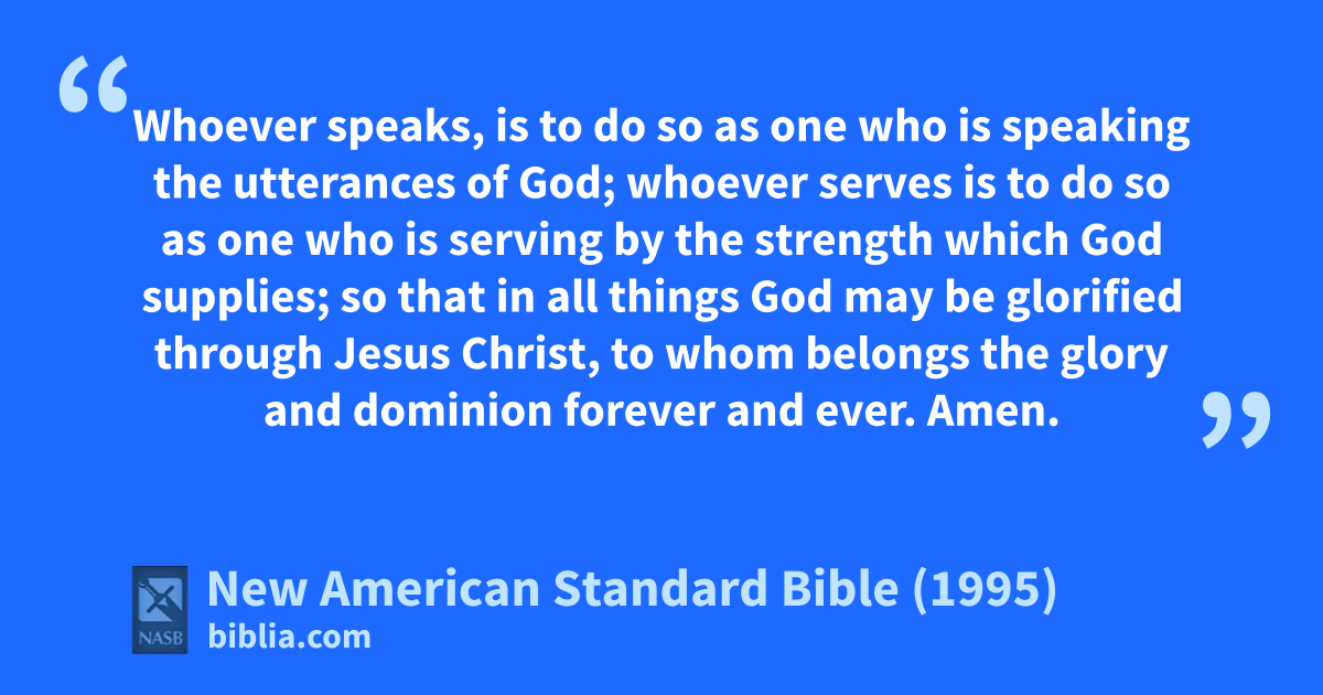 11 aWhoever speaks, is to do so 1as one who is speaking the butterances of God; whoever serves is to do so as one who is serving 2cby the strength which God supplies; so that din all things God may be glorified through Jesus Christ, eto whom belongs the glory and dominion forever and ever. Amen.