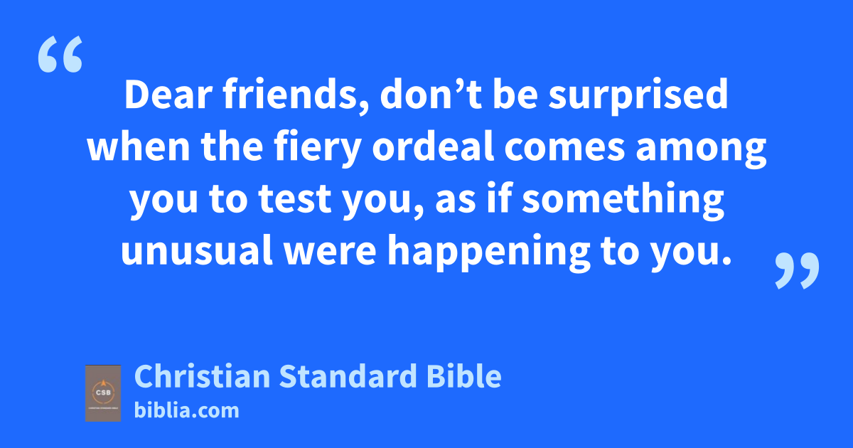 12 Dear friends, don’t be surprised when the fiery ordeal comes among you to test you, as if something unusual were happening to you.a 13 Instead, rejoice as you share in the sufferings of Christ,b so that you may also rejoice with great joy when his glory is revealed.c 14 If you are ridiculed for the name of Christ,d you are blessed, because the Spirite of glory and of GodD rests on you. 15 Let none of you suffer as a murderer, a thief, an evildoer, or a meddler.E 16 But if anyone suffers as a Christian, let him not be ashamed but let him glorify God in having that name.F 17 For the time has come for judgmentf to begin with God’s household,g and if it begins with us, what will the outcome be for those who disobey the gospel of God?