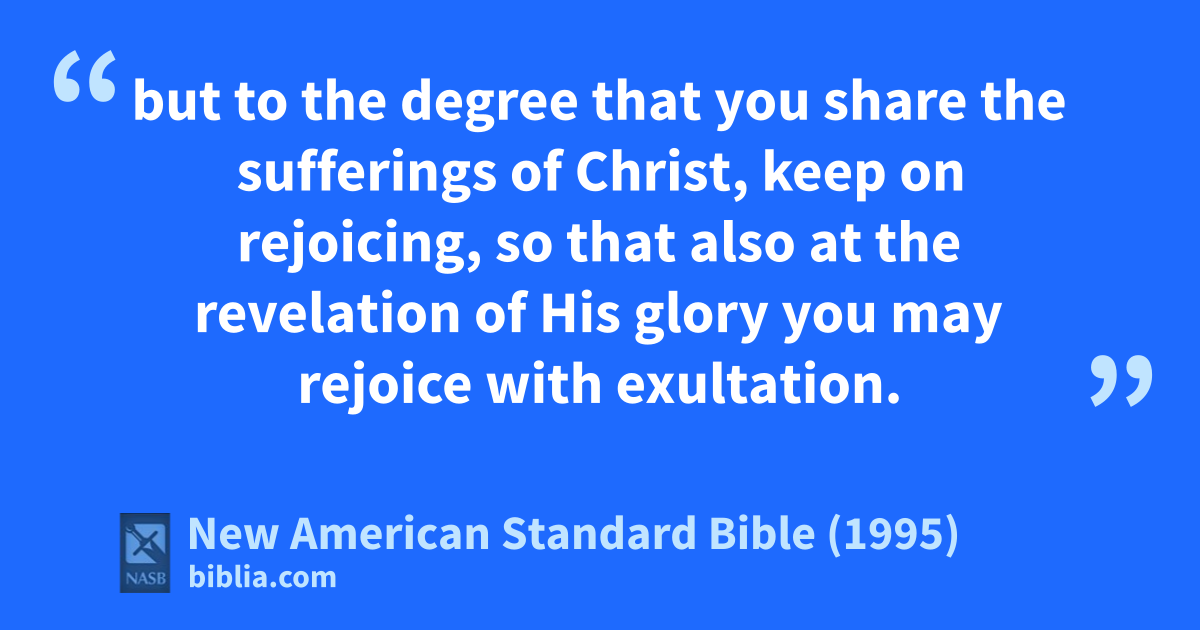 13 but to the degree that you ashare the sufferings of Christ, keep on rejoicing, so that also at the brevelation of His glory cyou may rejoice with exultation.