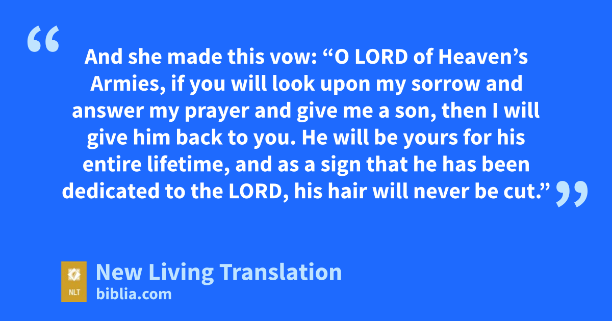 9 Once after a sacrificial meal at Shiloh, Hannah got up and went to pray. Eli the priest was sitting at his customary place beside the entrance of the Tabernacle.* 10 Hannah was in deep anguish, crying bitterly as she prayed to the Lord. 11 And she made this vow: “O Lord of Heaven’s Armies, if you will look upon my sorrow and answer my prayer and give me a son, then I will give him back to you. He will be yours for his entire lifetime, and as a sign that he has been dedicated to the Lord, his hair will never be cut.* ”