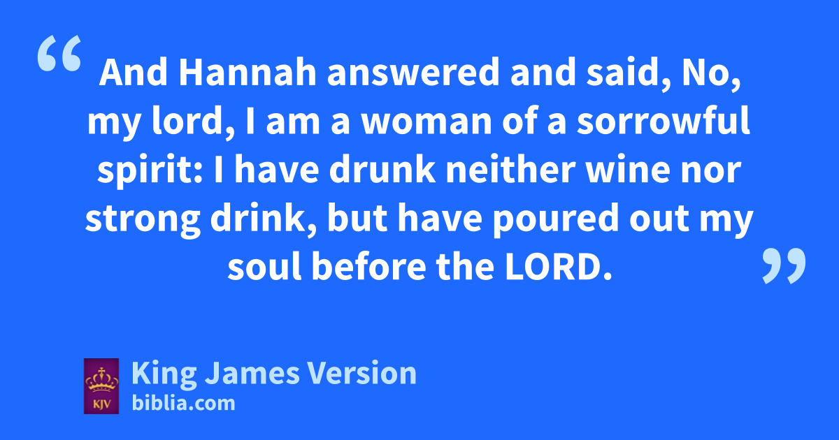 9 So Hannah rose up after they had eaten in gShiloh, and after they had drunk. Now Eli the priest sat upon a seat by a post of kthe temple of the Lord. 10 And she was l†in bitterness of soul, and prayed unto the Lord, and wept sore. 11 And she mvowed a vow, and said, O Lord of hosts, if thou wilt indeed nlook on the affliction of thine handmaid, and oremember me, and not forget thine handmaid, but wilt give unto thine handmaid †a man child, then I will give him unto the Lord all the days of his life, and pthere shall no rasor come upon his head. 12 And it came to pass, as she †continued praying before the Lord, that Eli marked her mouth. 13 Now Hannah, she spake in her heart; only her lips moved, but her voice was not heard: therefore Eli thought she had been drunken. 14 And Eli said unto her, How long wilt thou be drunken? put away thy wine from thee. 15 And Hannah answered and said, No, my lord, I am a woman †of a sorrowful spirit: I have drunk neither wine nor strong drink, but have qpoured out my soul before the Lord. 16 Count not thine handmaid for a daughter of rBelial: for out of the abundance of my ||complaint and grief have I spoken hitherto. 17 Then Eli answered and said, sGo in peace: and tthe God of Israel grant thee thy petition that thou hast asked of him. 18 And she said, uLet thine handmaid find grace in thy sight. So the woman xwent her way, and did eat, and her countenance was no more sad. 19 And they rose up in the morning early, and worshipped before the Lord, and returned, and came to their house to yRamah: and Elkanah knew Hannah his wife; and zthe Lord remembered her. 20 Wherefore it came to pass, †when the time was come about after Hannah had conceived, that she bare a son, and called his name ||Samuel, asaying, Because I have asked him of the Lord.