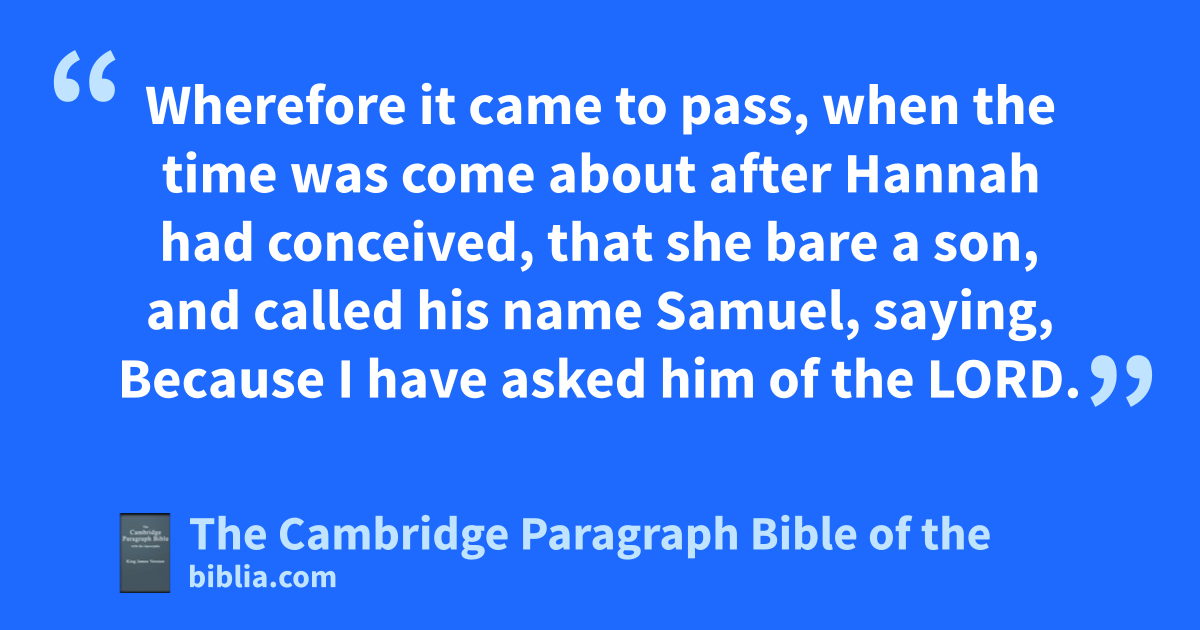 9 So Hannah rose up after they had eaten in gShiloh, and after they had drunk. Now Eli the priest sat upon a seat by a post of kthe temple of the Lord. 10 And she was l* in bitterness of soul, and prayed unto the Lord, and wept sore. 11 And she mvowed a vow, and said, O Lord of hosts, if thou wilt indeed nlook on the affliction of thine handmaid, and oremember me, and not forget thine handmaid, but wilt give unto thine handmaid * a man child, then I will give him unto the Lord all the days of his life, and pthere shall no rasor come upon his head. 12 And it came to pass, as she * continued praying before the Lord, that Eli marked her mouth. 13 Now Hannah, she spake in her heart; only her lips moved, but her voice was not heard: therefore Eli thought she had been drunken. 14 And Eli said unto her, How long wilt thou be drunken? put away thy wine from thee. 15 And Hannah answered and said, No, my lord, I am a woman * of a sorrowful spirit: I have drunk neither wine nor strong drink, but have qpoured out my soul before the Lord. 16 Count not thine handmaid for a daughter of rBelial: for out of the abundance of my * complaint and grief have I spoken hitherto. 17 Then Eli answered and said, sGo in peace: and tthe God of Israel grant thee thy petition that thou hast asked of him. 18 And she said, uLet thine handmaid find grace in thy sight. So the woman xwent her way, and did eat, and her countenance was no more sad. 19 And they rose up in the morning early, and worshipped before the Lord, and returned, and came to their house to yRamah: and Elkanah knew Hannah his wife; and zthe Lord remembered her. 20 Wherefore it came to pass, * when the time was come about after Hannah had conceived, that she bare a son, and called his name * Samuel, asaying, Because I have asked him of the Lord.