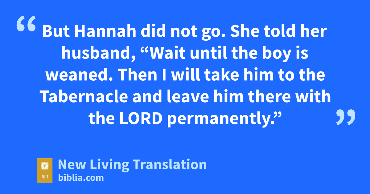 21 The next year Elkanah and his family went on their annual trip to offer a sacrifice to the Lord and to keep his vow. 22 But Hannah did not go. She told her husband, “Wait until the boy is weaned. Then I will take him to the Tabernacle and leave him there with the Lord permanently.* ”