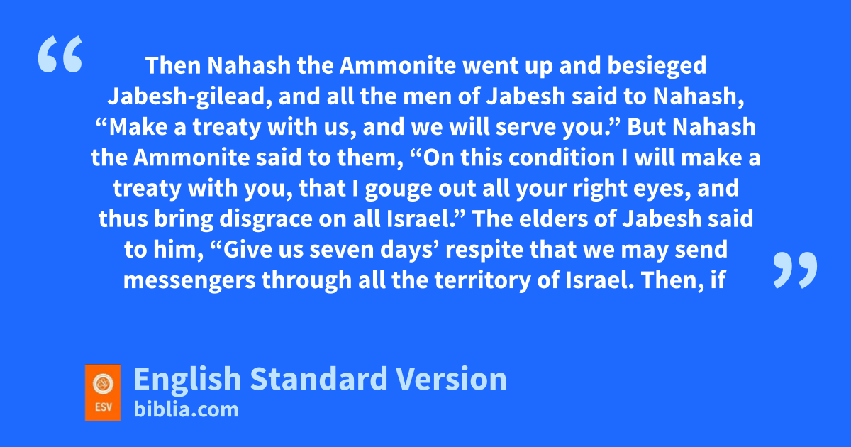 11 oThen Nahash the Ammonite went up and besieged pJabesh-gilead, and all the men of Jabesh said to Nahash, q“Make a treaty with us, and we will serve you.” 2 But Nahash the Ammonite said to them, “On this condition I will make a treaty with you, rthat I gouge out all your right eyes, and thus sbring disgrace on all Israel.” 3 The elders of Jabesh said to him, “Give us seven days’ respite that we may send messengers through all the territory of Israel. Then, if there is no one to save us, we will give ourselves up to you.” 4 When the messengers came to tGibeah of Saul, they reported the matter in the ears of the people, uand all the people wept aloud.