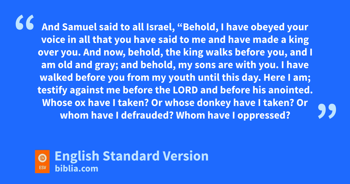 12 And Samuel said to all Israel, “Behold, I have obeyed nyour voice in all that you have said to me oand have made a king over you. 2 And now, behold, the king pwalks before you, qand I am old and gray; and behold, my sons are with you. I have walked before you from my youth until this day. 3 Here I am; testify against me before the Lord and before rhis anointed. sWhose ox have I taken? Or whose donkey have I taken? Or whom have I defrauded? Whom have I oppressed? Or from whose hand have I taken a bribe to blind my eyes with it? Testify against me1 and I will restore it to you.” 4 They said, “You have not defrauded us or oppressed us or taken anything from any man’s hand.” 5 And he said to them, “The Lord is witness against you, and rhis anointed is witness this day, that you have not found anything tin my hand.” And they said, “He is witness.”
