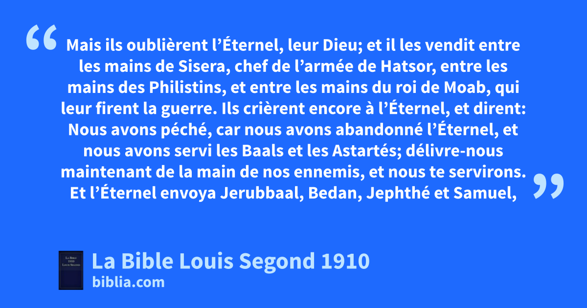 6Alors Samuel dit au peuple: C’est l’Éternel qui a établi Moïse et Aaron, et qui a fait monter vos pères du pays d’Égypte. 7Maintenant, présentez-vous, et je vous jugerai devant l’Éternel sur tous les bienfaits que l’Éternel vous a accordés, à vous et à vos pères. 8aAprès que Jacob fut venu en Égypte, bvos pères crièrent à l’Éternel, et l’Éternel cenvoya Moïse et Aaron, qui firent sortir vos pères d’Égypte et les firent habiter dans ce lieu. 9Mais ils oublièrent l’Éternel, leur Dieu; et il les vendit entre les mains de dSisera, chef de l’armée de Hatsor, entre eles mains des Philistins, et entre les mains du froi de Moab, qui leur firent la guerre. 10Ils crièrent encore à l’Éternel, et dirent: Nous avons péché, car nous avons abandonné l’Éternel, et nous avons servi les Baals et les Astartés; délivre-nous maintenant de la main de nos ennemis, et nous te servirons. 11Et l’Éternel envoya gJerubbaal, hBedan, iJephthé et Samuel, et il vous délivra de la main de vos ennemis qui vous entouraient, et vous demeurâtes en sécurité. 12Puis, voyant que Nachasch, roi des fils d’Ammon, marchait contre vous, jvous m’avez dit: Non! mais un roi régnera sur nous. Et cependant l’Éternel, votre Dieu, était votre roi. 13Voici donc le roi que vous avez choisi, kque vous avez demandé; voici, l’Éternel a mis sur vous un roi. 14Si lvous craignez l’Éternel, si vous le servez, si vous obéissez à sa voix, et si vous n’êtes point rebelles à la parole de l’Éternel, vous vous attacherez à l’Éternel, votre Dieu, vous et le roi qui règne sur vous. 15Mais si vous n’obéissez pas à la voix de l’Éternel, et si vous êtes rebelles à la parole de l’Éternel, la main de l’Éternel sera contre vous, comme elle a été contre vos pères. 16Attendez encore ici, et voyez le prodige que l’Éternel va opérer sous vos yeux. 17Ne sommes-nous pas à la moisson des blés? J’invoquerai l’Éternel, et il enverra du tonnerre et de la pluie. Sachez alors et voyez combien vous avez eu tort aux yeux de l’Éternel de demander pour vous un roi. 18Samuel invoqua l’Éternel, et l’Éternel envoya ce même jour du tonnerre et de la pluie. Tout le peuple eut une grande crainte de l’Éternel et de Samuel. 19Et tout le peuple dit à Samuel: Prie l’Éternel, ton Dieu, pour tes serviteurs, afin que nous ne mourions pas; car nous avons ajouté à tous nos péchés le tort de demander pour nous un roi. 20Samuel dit au peuple: N’ayez point de crainte! Vous avez fait tout ce mal; mais ne vous détournez pas de l’Éternel, et servez l’Éternel de tout votre coeur. 21Ne vous en détournez pas; sinon, vous iriez après des choses de néant, qui n’apportent ni profit ni délivrance, parce que ce sont des choses de néant. 22L’Éternel n’abandonnera point son peuple, à cause de son grand nom, car l’Éternel a résolu de faire de vous son peuple. 23Loin de moi aussi de pécher contre l’Éternel, de cesser de prier pour vous! Je vous enseignerai le bon et le droit chemin. 24Craignez seulement l’Éternel, et servez-le fidèlement de tout votre coeur; car voyez quelle puissance il déploie parmi vous. 25Mais si vous faites le mal, vous périrez, vous et votre roi.