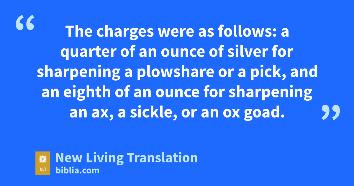 19 There were no blacksmiths in the land of Israel in those days. The Philistines wouldn’t allow them for fear they would make swords and spears for the Hebrews. 20 So whenever the Israelites needed to sharpen their plowshares, picks, axes, or sickles,* they had to take them to a Philistine blacksmith. 21 The charges were as follows: a quarter of an ounce* of silver for sharpening a plowshare or a pick, and an eighth of an ounce* for sharpening an ax, a sickle, or an ox goad. 22 So on the day of the battle none of the people of Israel had a sword or spear, except for Saul and Jonathan.