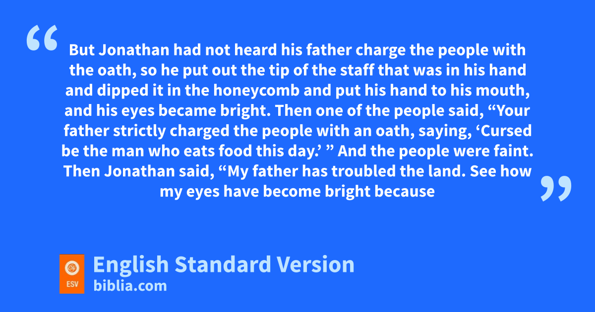 24 And the men of Israel had been hard pressed that day, bso Saul had laid an oath on the people, saying, “Cursed be the man who eats food until it is evening and I am avenged on my enemies.” So none of the people had tasted food. 25 Now when all the people7 came to the forest, behold, there was honey on the ground. 26 And when the people entered the forest, behold, the honey was dropping, but no one put his hand to his mouth, for the people feared the oath. 27 But Jonathan had not heard his father charge the people with the oath, cso he put out the tip of the staff that was in his hand and dipped it in the honeycomb and put his hand to his mouth, and his eyes became bright. 28 Then one of the people said, “Your father strictly charged the people with an oath, saying, ‘Cursed be the man who eats food this day.’ ” And the people were dfaint. 29 Then Jonathan said, “My father has troubled the land. See how my eyes have become bright because I tasted a little of this honey. 30 How much better if the people had eaten freely today of the spoil of their enemies that they found. For now the defeat among the Philistines has not been great.”