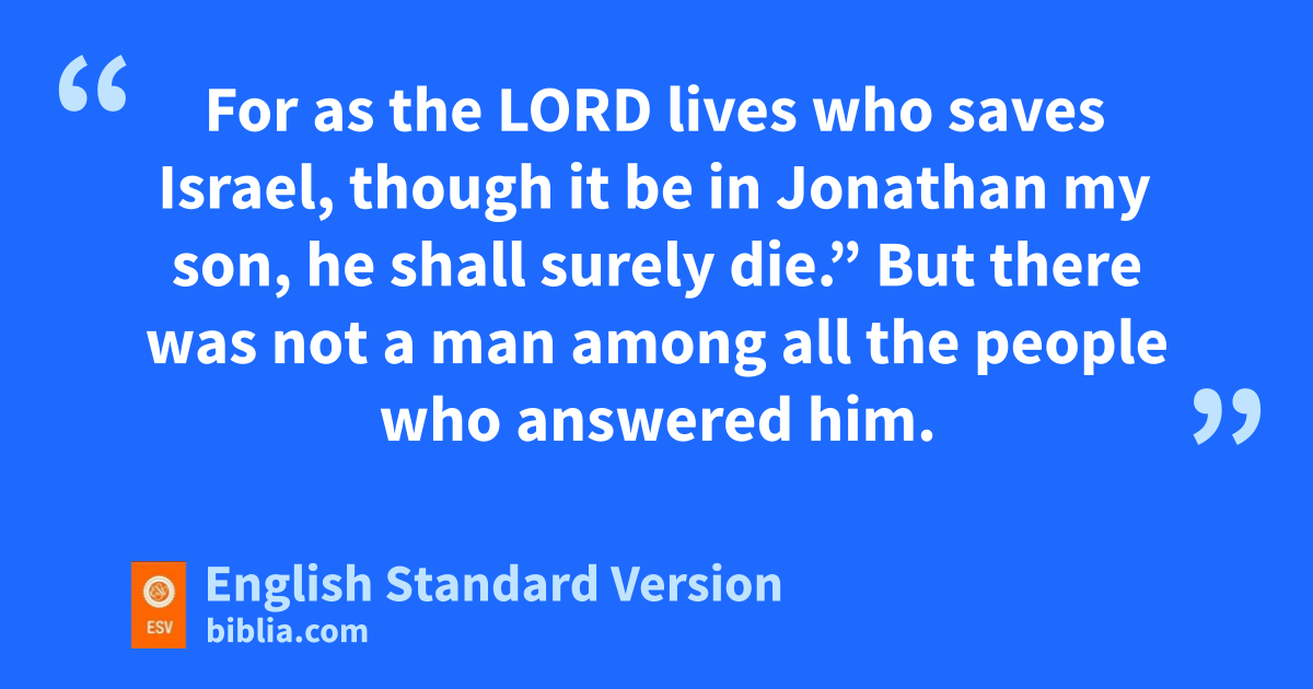 43 Then Saul said to Jonathan, o“Tell me what you have done.” And Jonathan told him, p“I tasted a little honey with the tip of the staff that was in my hand. Here I am; I will die.” 44 And Saul said, q“God do so to me and more also; ryou shall surely die, Jonathan.” 45 Then the people said to Saul, “Shall Jonathan die, who has worked this great salvation in Israel? Far from it! lAs the Lord lives, sthere shall not one hair of his head fall to the ground, for he has worked with God this day.” So the people ransomed Jonathan, so that he did not die. 46 Then Saul went up from pursuing the Philistines, and the Philistines went to their own place.
