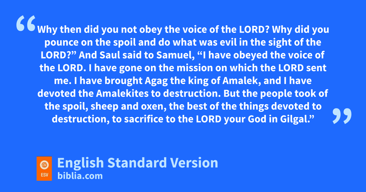 17 And Samuel said, s“Though you are little in your own eyes, are you not the head of the tribes of Israel? The Lord anointed you king over Israel. 18 And the Lord sent you on a mission and said, ‘Go, devote to destruction the sinners, the Amalekites, and fight against them until they are consumed.’ 19 Why then did you not obey the voice of the Lord? tWhy did you pounce on the spoil and do what was evil in the sight of the Lord?” 20 And Saul said to Samuel, u“I have obeyed the voice of the Lord. I have gone on the mission on which the Lord sent me. I have brought Agag the king of Amalek, and I have devoted the Amalekites to destruction. 21 vBut the people took of the spoil, sheep and oxen, the best of the things devoted to destruction, to sacrifice to the Lord your God in Gilgal.” 22 And Samuel said,