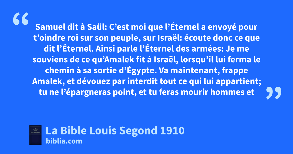 1Samuel dit à Saül: C’est moi que l’Éternel a envoyé pour t’oindre roi sur son peuple, sur Israël: écoute donc ce que dit l’Éternel. 2Ainsi parle l’Éternel des armées: aJe me souviens de ce qu’Amalek fit à Israël, lorsqu’il lui ferma le chemin à sa sortie d’Égypte. 3Va maintenant, frappe Amalek, et dévouez par interdit tout ce qui lui appartient; tu ne l’épargneras point, et tu feras mourir hommes et femmes, enfants et nourrissons, boeufs et brebis, chameaux et ânes. 4Saül convoqua le peuple, et en fit la revue à Thelaïm: il y avait deux cent mille hommes de pied, et dix mille hommes de Juda. 5Saül marcha jusqu’à la ville d’Amalek, et mit une embuscade dans la vallée. 6Il dit aux bKéniens: Allez, retirez-vous, sortez du milieu d’Amalek, afin que je ne vous fasse pas périr avec lui; ccar vous avez eu de la bonté pour tous les enfants d’Israël, lorsqu’ils montèrent d’Égypte. Et les Kéniens se retirèrent du milieu d’Amalek. 7Saül battit Amalek depuis Havila jusqu’à Schur, qui est en face de l’Égypte. 8Il prit vivant dAgag, roi d’Amalek, et il dévoua par interdit tout le peuple en le passant au fil de l’épée. 9Mais Saül et le peuple épargnèrent Agag, et les meilleures brebis, les meilleurs boeufs, les meilleures bêtes de la seconde portée, les agneaux gras, et tout ce qu’il y avait de bon; ils ne voulurent pas le dévouer par interdit, et ils dévouèrent seulement tout ce qui était méprisable et chétif.