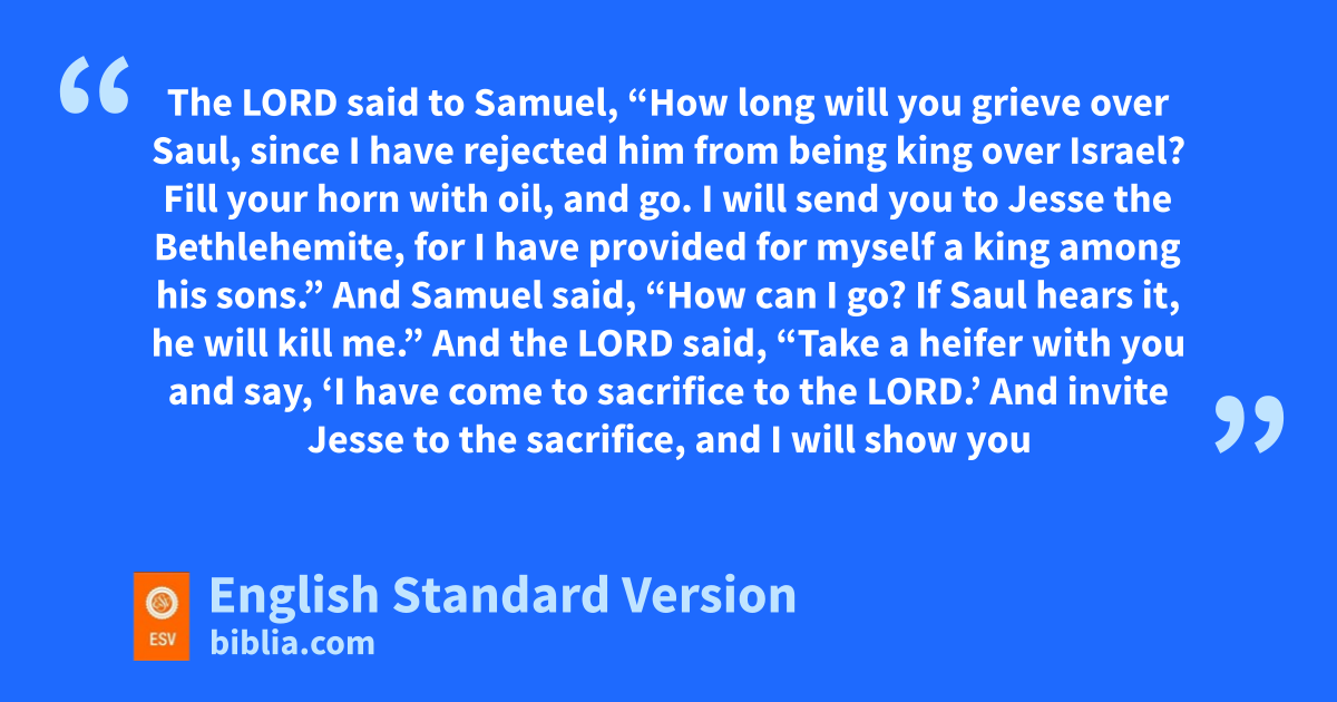 16 The Lord said to Samuel, r“How long will you grieve over Saul, since sI have rejected him from being king over Israel? tFill your horn with oil, and go. I will send you to Jesse the Bethlehemite, ufor I have provided for myself a king among his sons.” 2 And Samuel said, “How can I go? If Saul hears it, he will kill me.” And the Lord said, “Take a heifer with you and say, v‘I have come to sacrifice to the Lord.’ 3 And invite Jesse to the sacrifice, and I will show you what you shall do. wAnd you shall anoint for me him whom I declare to you.” 4 Samuel did what the Lord commanded and came to Bethlehem. The elders of the city xcame to meet him trembling and said, y“Do you come peaceably?” 5 And he said, “Peaceably; I have come to sacrifice to the Lord. zConsecrate yourselves, and come with me to the sacrifice.” And he consecrated Jesse and his sons and invited them to the sacrifice.