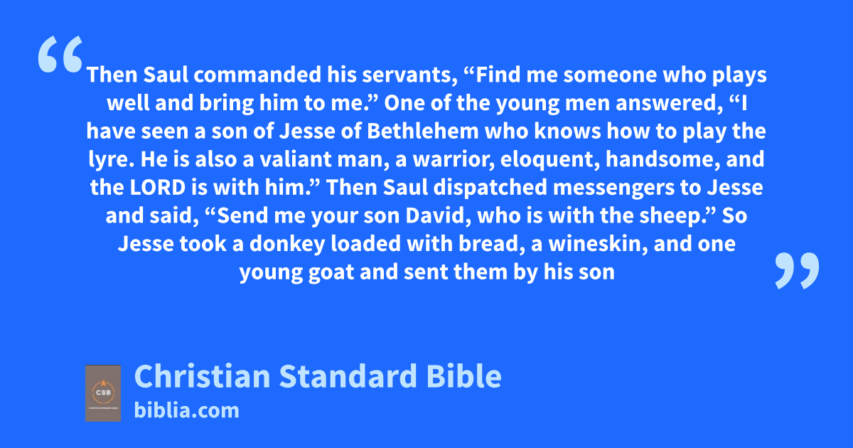 19 Then Saul dispatched messengers to Jesse and said, “Send me your son David, who is with the sheep.” 20 So Jesse took a donkey loaded with bread, a wineskin, and one young goat and sent them by his son David to Saul.ac 21 When David came to Saulad and entered his service, Saul loved him very much, and David became his armor-bearer. 22 Then Saul sent word to Jesse: “Let David remain in my service, for he has found favor with me.” 23 Whenever the spirit from God came on Saul,ae David would pick up his lyre and play, and Saul would then be relieved, feel better, and the evil spirit would leave him.