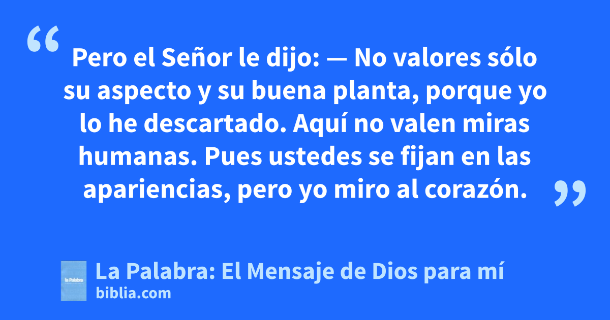 — No valores sólo su aspecto y su buena planta, porque yo lo he descartado. Aquí no valen miras humanas. Pues ustedes se fijan en las apariencias, pero yo miro al corazón.