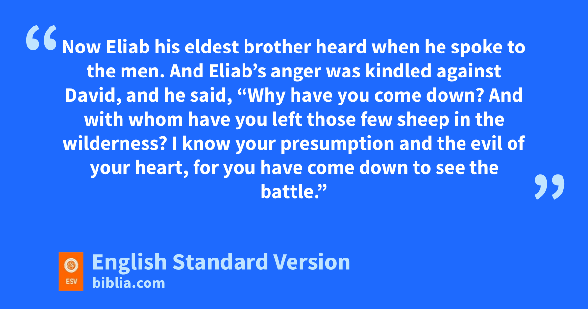 28 Now Eliab his eldest brother heard when he spoke to the men. And Eliab’s anger was kindled against David, and he said, “Why have you come down? And with whom have you left those few sheep in the wilderness? I know your presumption and the evil of your heart, for you have come down to see the battle.” 29 And David said, “What have I done now? Was it not but a word?” 30 And he turned away from him toward another, and spoke bin the same way, and the people answered him again as before.