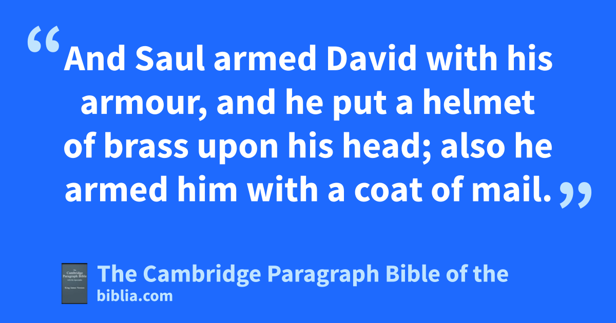 32 And David said to Saul, bLet no man’s heart fail because of him; cthy servant will go and fight with this Philistine. 33 And Saul said to David, Thou art not able to go against this Philistine to fight with him: for thou art but a youth, and he a man of war from his youth. 34 And David said unto Saul, Thy servant kept his father’s sheep, and there came a lion and a bear, and took a * lamb out of the flock: 35 and I went out after him, and smote him, and delivered it out of his mouth: and when he arose against me, I caught him by his beard, and smote him, and slew him. 36 Thy servant slew both the lion and the bear: and this duncircumcised Philistine shall be as one of them, dseeing he hath defied the armies of the living God. 37 David said moreover, eThe Lord that delivered me out of the paw of the lion, and out of the paw of the bear, he will deliver me out of the hand of this Philistine. And Saul said unto David, Go, and fthe Lord be with thee. 38 And Saul * armed David with his armour, and he put a helmet of brass upon his head; also he armed him with a coat of mail. 39 And David girded his sword upon his armour, and he assayed to go; for he had not proved it. And David said unto Saul, I cannot go with these; for I have not proved them. And David put them off him. 40 And he took his staff in his hand, and chose him five smooth stones out of the * brook, and put them in a shepherd’s * bag which he had, even in a scrip; and his sling was in his hand: and he drew near to the Philistine. 41 And the Philistine came on and drew near unto David; and gthe man that bare the shield went before him. 42 And when the Philistine looked about, and saw David, he disdained him: for he was but a youth, and hruddy, and of a fair countenance. 43 And the Philistine said unto David, iAm I a dog, that thou comest to me with staves? And the Philistine cursed David by his gods. 44 And the Philistine said to David, Come to me, and I will give thy flesh unto the fowls of the air, and to the beasts of the field. 45 Then said David to the Philistine, Thou comest to me with a sword, and with a spear, and with a kshield: but I come to thee in the name of the Lord of hosts, the God of the armies of Israel, whom thou hast ldefied. 46 This day will the Lord * deliver thee into mine hand; and I will smite thee, and take thine head from thee; and I will give mthe carcases of the host of the Philistines this day nunto the fowls of the air, and to the wild beasts of the earth; othat all the earth may know that there is a God in Israel. 47 And all this assembly shall know that the Lord psaveth not with sword and spear: for qthe battle is the Lord’s, and rhe will give you into our hands. 48 And it came to pass, when the Philistine arose, and came and drew nigh to meet David, that David hasted, and ran toward the army to meet the Philistine. 49 And David put his hand in his bag, and took thence a stone, and slang it, and smote the Philistine in his forehead, that the stone sunk into his forehead; and he fell upon his face to the earth. 50 So sDavid prevailed over the Philistine with a sling and with a stone, and smote the Philistine, and slew him; but there was no sword in the hand of David. 51 Therefore David ran, and stood upon the Philistine, and took this sword, and drew it out of the sheath thereof, and slew him, and ucut off his head therewith. And when the Philistines saw their champion was dead, they fled. 52 And the men of Israel and of Judah arose, and shouted, and pursued the Philistines, until thou come to the valley, and to the gates of vEkron. And the wounded of the Philistines fell down by the way to wShaaraim, even unto xGath, and unto Ekron. 53 And the children of Israel returned from chasing after the Philistines, and they spoiled their tents. 54 And David took the head of the Philistine, and brought it to yJerusalem; but he put his armour in his tent.