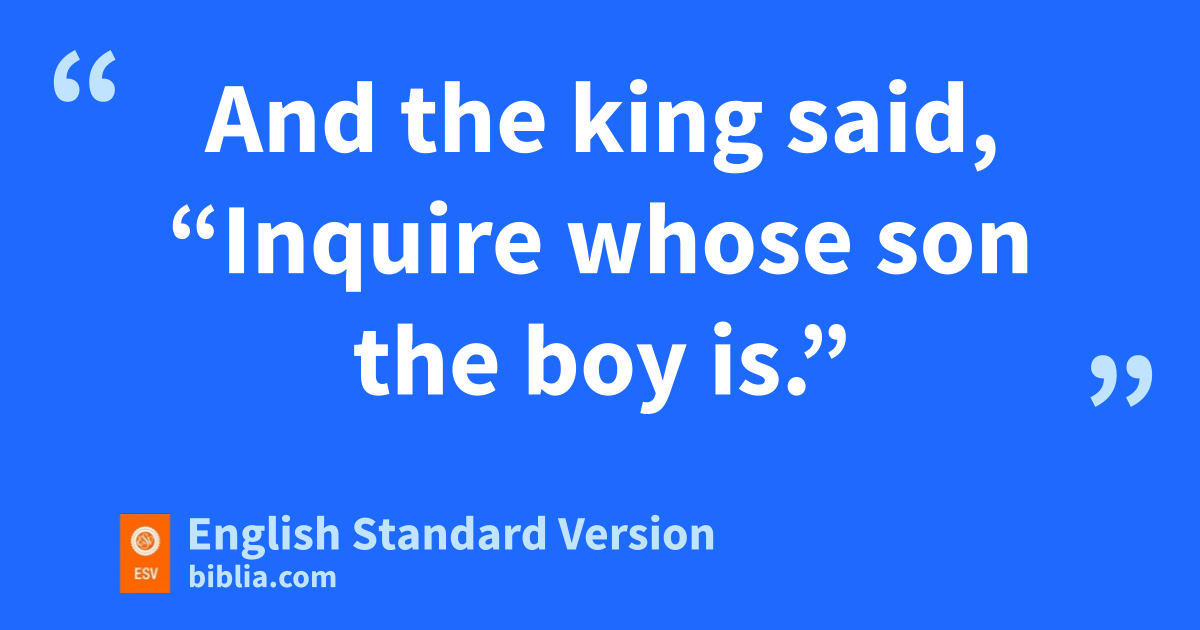 55 As soon as Saul saw David go out against the Philistine, he said to Abner, ythe commander of the army, “Abner, zwhose son is this youth?” And Abner said, a“As your soul lives, O king, I do not know.” 56 And the king said, “Inquire whose son the boy is.” 57 And as soon as David returned from the striking down of the Philistine, Abner took him, and brought him before Saul bwith the head of the Philistine in his hand. 58 And Saul said to him, “Whose son are you, young man?” And David answered, c“I am the son of your servant Jesse the Bethlehemite.”