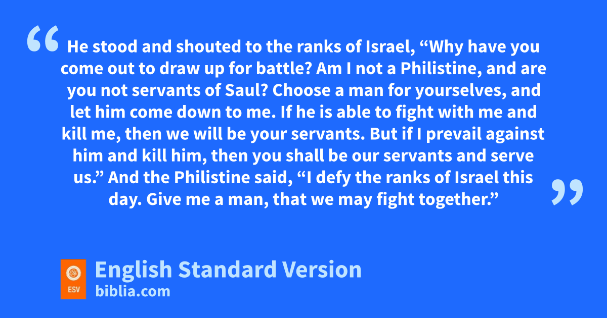17 Now the Philistines vgathered their armies for battle. And they were gathered at wSocoh, which belongs to Judah, and encamped between Socoh and xAzekah, in yEphes-dammim. 2 And Saul and the men of Israel were gathered, and encamped in zthe Valley of Elah, and drew up in line of battle against the Philistines. 3 And the Philistines stood on the mountain on the one side, and Israel stood on the mountain on the other side, with a valley between them. 4 And there came out from the camp of the Philistines a champion named aGoliath of bGath, whose height was six1 cubits2 and a span. 5 He had a helmet of bronze on his head, and he was armed with a coat of mail, and the weight of the coat was five thousand shekels3 of bronze. 6 And he had bronze armor on his legs, and a cjavelin of bronze slung between his shoulders. 7 The shaft of his spear was like a weaver’s beam, and his spear’s head weighed six hundred shekels of iron. dAnd his shield-bearer went before him. 8 He stood and shouted to the ranks of Israel, “Why have you come out to draw up for battle? Am I not a Philistine, and eare you not servants of Saul? Choose a man for yourselves, and let him come down to me. 9 If he is able to fight with me and kill me, then we will be your servants. But if I prevail against him and kill him, then you shall be our servants fand serve us.” 10 And the Philistine said, g“I defy the ranks of Israel this day. Give me a man, that we may fight together.” 11 When Saul and all Israel heard these words of the Philistine, they were dismayed and greatly afraid.