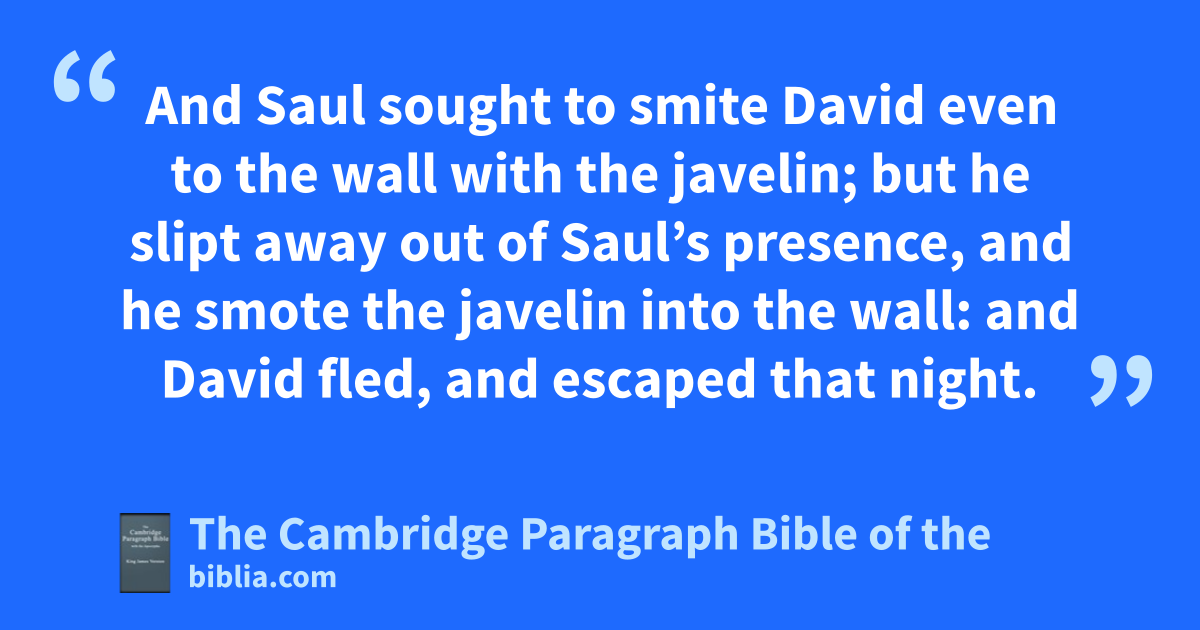 8 * And there was war again: and David went out, and fought with the Philistines, and slew them with a great slaughter; and they fled from * him. 9 And ithe evil spirit from the Lord was upon Saul, as he sat in his house with his javelin in his hand: and David jplayed with his hand. 10 And Saul sought to smite David even to the wall with the javelin; but he slipt away out of Saul’s presence, and he smote the javelin into the wall: and David fled, and escaped that night. 11 kSaul also sent messengers unto David’s house, to watch him, and to slay him in the morning: and Michal David’s wife told him, saying, If thou save not thy life to night, to morrow thou shalt be slain.