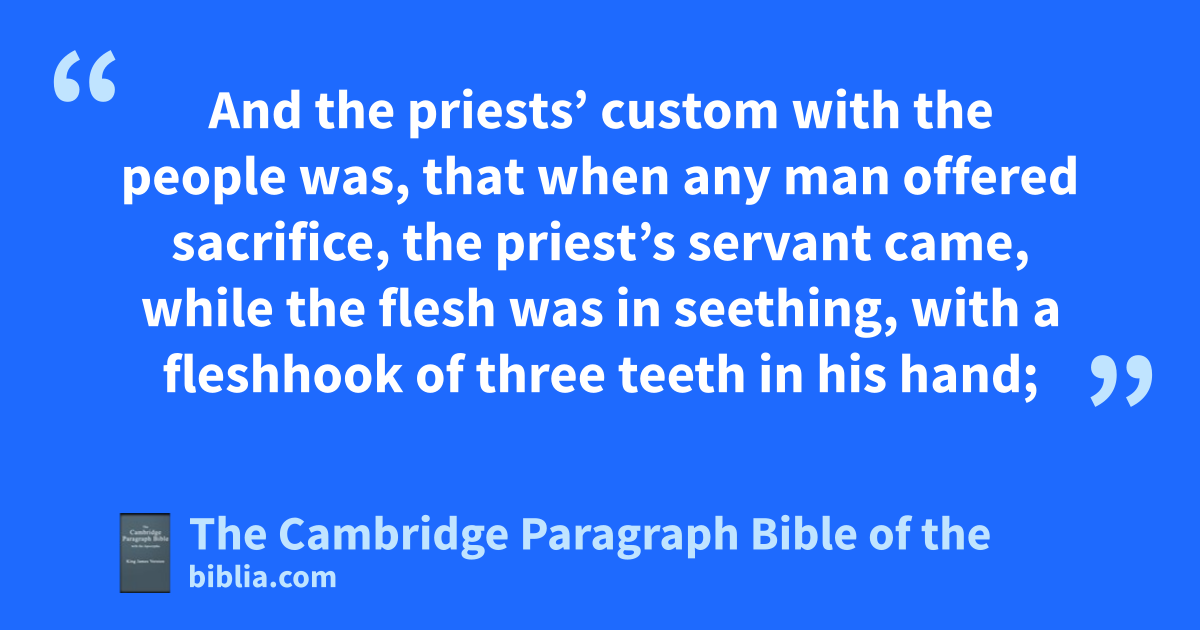 12 Now the sons of Eli were asons of Belial; bthey knew not the Lord. 13 And the priests’ custom with the people was, that when any man offered sacrifice, the priest’s servant came, while the flesh was in seething, with a fleshhook of three teeth in his hand; 14 and he strooke it into the pan, or kettle, or caldron, or pot; call that the fleshhook brought up the priest took for himself. So they did in Shiloh unto all the Israelites that came thither. 15 Also before they dburnt the fat, the priest’s servant came, and said to the man that sacrificed, Give flesh to roast for the priest; for he will not have sodden flesh of thee, but raw. 16 And if any man said unto him, Let them not fail to burn the fat * presently, and then take as much as thy soul desireth; then he would answer him, Nay; but thou shalt give it me now: and if not, I will take it by force. 17 Wherefore the sin of the young men was very great ebefore the Lord: for men fabhorred the offering of the Lord.